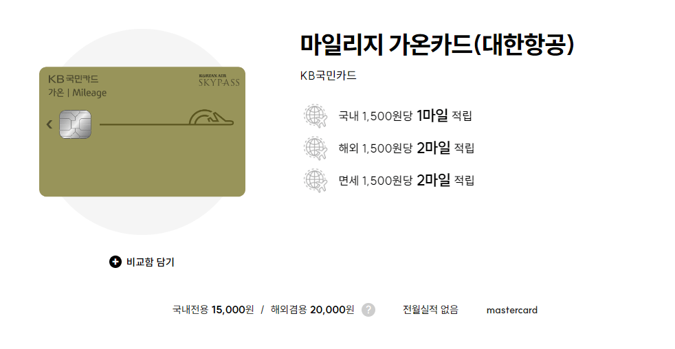 가장 먼저 추천드릴 카드는 국민 마일리지 가온카드입니다. 이 카드는 구매대행사업을 하시 거나 해외쇼핑 많이 하시는 분들께 특히 추천드립니다. 대한항공 기준으로 국내 모든 가맹점에서 일시불 및 할부이용금액 1,500원당 1 마일리지 적립되며, 해외가맹점(직구/온라인포함)이나 면세점 업종에서 이용금액 1,500원당 2 마일리지 적립되기 때문입니다. 연회비는 국내 전용 15,000원, 해외 겸용 20,000원입니다. 연회비가 저렴함에도 불구하고 전월실적 조건 없이 무제한 적립 가능하기 때문에 발급 추천드리는 카드입니다. 연회비 지원까지 받으면 후회하지 않으실 겁니다.