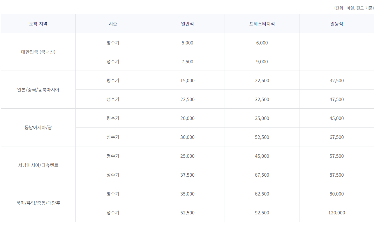 최근 개정된 대한항공 마일리지 공제표도 올려드립니다.